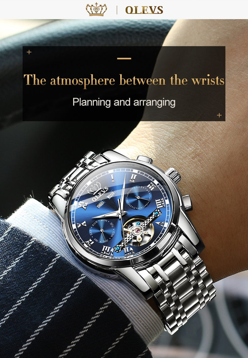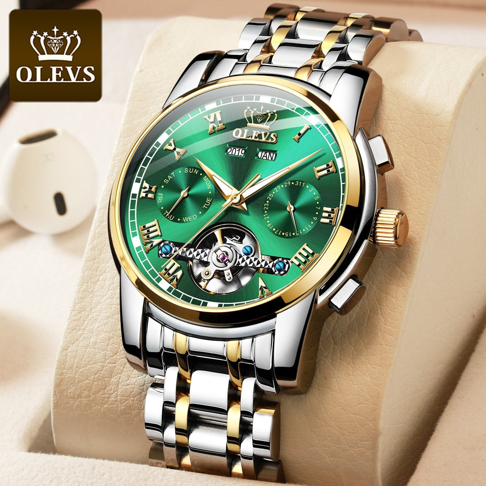 OLEVS Automatic Mechanical Men Watches Stainless Steel Waterproof Date Week Green Fashion Classic Wrist Watches